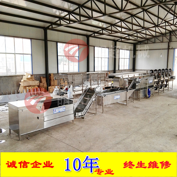 6.漂燙冷卻線:根莖類切制的是土豆、紅薯、蓮藕、茄子、黃瓜、蔬菜、山野菜等等,比如土豆切成絲后,里面的纖維收到破壞,跟空氣結合可使土豆絲變黑,有類似情況的蔬菜,都需要進行漂燙冷卻生產線,針對蔬菜如果沒有這種情況的這道工序可以不用,具體還要看情況而定,漂燙冷卻生產線主要是采用水浴式,水可達到0-100攝氏度以內,對果蔬進行漂燙、殺青、蒸煮或者包裝袋的殺菌等等,是一種多功能巴氏殺菌冷卻線的設備,水槽內部設有循環水泵,水的溫度均勻,果蔬進行漂燙的過程中受熱均勻,網帶伸縮性強,在這里介紹一下網帶,網帶的密度是根據要物料的大小來單獨定制的,這個就跟廠家有關系了,在這里就簡單的讓用戶知道有這方面知識,簡單了解一下就可以,漂燙后的果蔬需要進行冷卻,冷卻機的冷卻方式采用常溫水或強制冰水,還有為了讓蔬菜的保鮮程度高一些,可以采用磁化水,這個在咨詢前一定要跟我們明超機械銷售人員說清楚