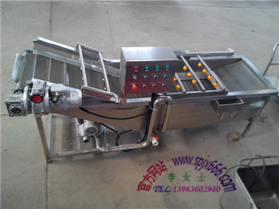 3、蔬菜漂洗機:對蔬菜進行二次的漂洗,可以達到蔬菜潔凈度,該機采用SUS304不銹鋼材質制造,該機模擬手工清洗,通過鼓風機將水達到翻騰的狀態,蔬菜不直接接觸設備,在水中利用水的沖力,水槽上端設有噴淋裝置,可配合水的力度,將蔬菜清洗達到潔凈度,而且不傷害蔬菜表皮,達到客戶的需求,保持蔬菜的新鮮度。