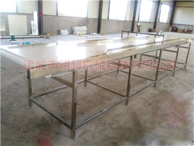 該機采用雙層進行輸送,上面一層采用pvc輸送,當蔬菜輸送到中間之后,通過強制分離裝置,分離到切菜機入口,當蔬菜從切菜機入口進入到里面,切完后再通過底層的第二層不銹鋼網帶輸送提升到下一工序,運行速度可調。