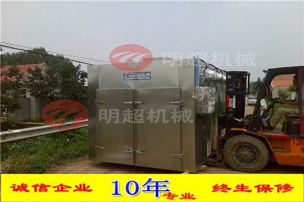 沙果干瀝水后,需要人工將沙果干放入烤盤后,再放入烘車上面,然后關閉烘干房門,第壹次烘干需要調試控制器,將烘干溫度和烘干時間,排濕時間調試好后,以后再烘干,就不需要調試了,采用192盤烘干房,烤盤尺寸:640*460*45mm,設備尺寸:4500*2400*2700mm,功率:72kw【實際用電量24kw】加熱方式為電加熱,采用數控數顯,風機采用全鋁,保溫采用硅酸鋁,厚度為8cm